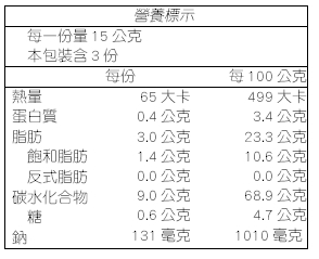 t成分:馬鈴薯條[馬鈴薯澱粉、 馬鈴薯、鹽、糖、膨脹劑(碳酸氫鈉)、 大蒜、甜味劑(醋磺內酯鉀)、著色劑、 (食用黃色四號、食用黃色五號)】、 棕櫚油、海鮮調味粉(飛魚、鮪魚、 糖、碗豆粉、棕櫚油、蝦、醬油、 鹽)、烤蒜粉(鹽、L-麩酸鈉、蒜粉、 蒜粒、糖、匈牙利紅椒粉、胺基乙酸)