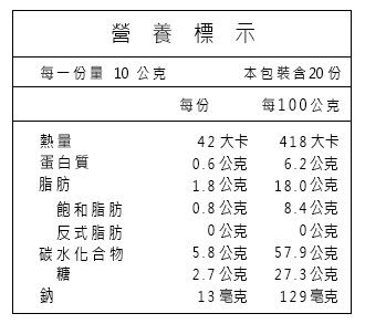 成 份: 麵粉、砂糖、雞蛋、棕櫚油、鮮奶、 食用烤酥油、奶粉、食鹽、泡打粉(酸性焦磷酸鈉、碳酸氫鈉、玉米澱粉(非基改)、碳酸二氫鈣)、大豆卵磷脂