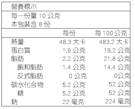 成分:全脂奶粉、砂糖、硬脂酸鎂、二氧化矽、海藻鈣、凝結芽孢桿菌