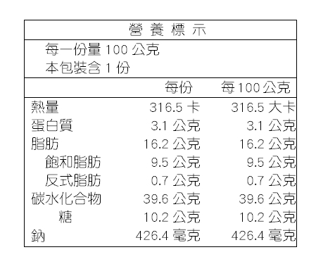 成 份:麵包粉(羥丙基磷酸二澱粉.羥丙基澱粉.小麥蛋白.糖)小麥麵粉.糖粉(蔗糖.樹薯澱粉).鹽.水.奶油.起士粉(牛乳.海鹽.乳酪基.凝乳酶.防腐劑(鏈黴菌素).乳清蛋白.氫化羥丙澱粉.羧甲基纖維素鈉) 起士片(牛奶.鹽.乳酸菌.凝乳酵素.水.牛乳固形物.檸檬酸鈉. 大豆卵磷脂.非乳脂固形物 .檸檬酸.已二烯酸.胡蘿蔔色素).雞蛋.沙拉油